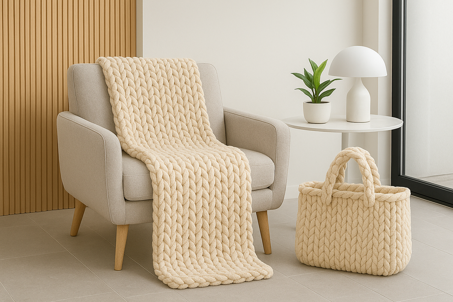 Chaque couverture est entièrement tricotée à la main, sans aiguille, avec du fil chenille épais et ultra-doux.