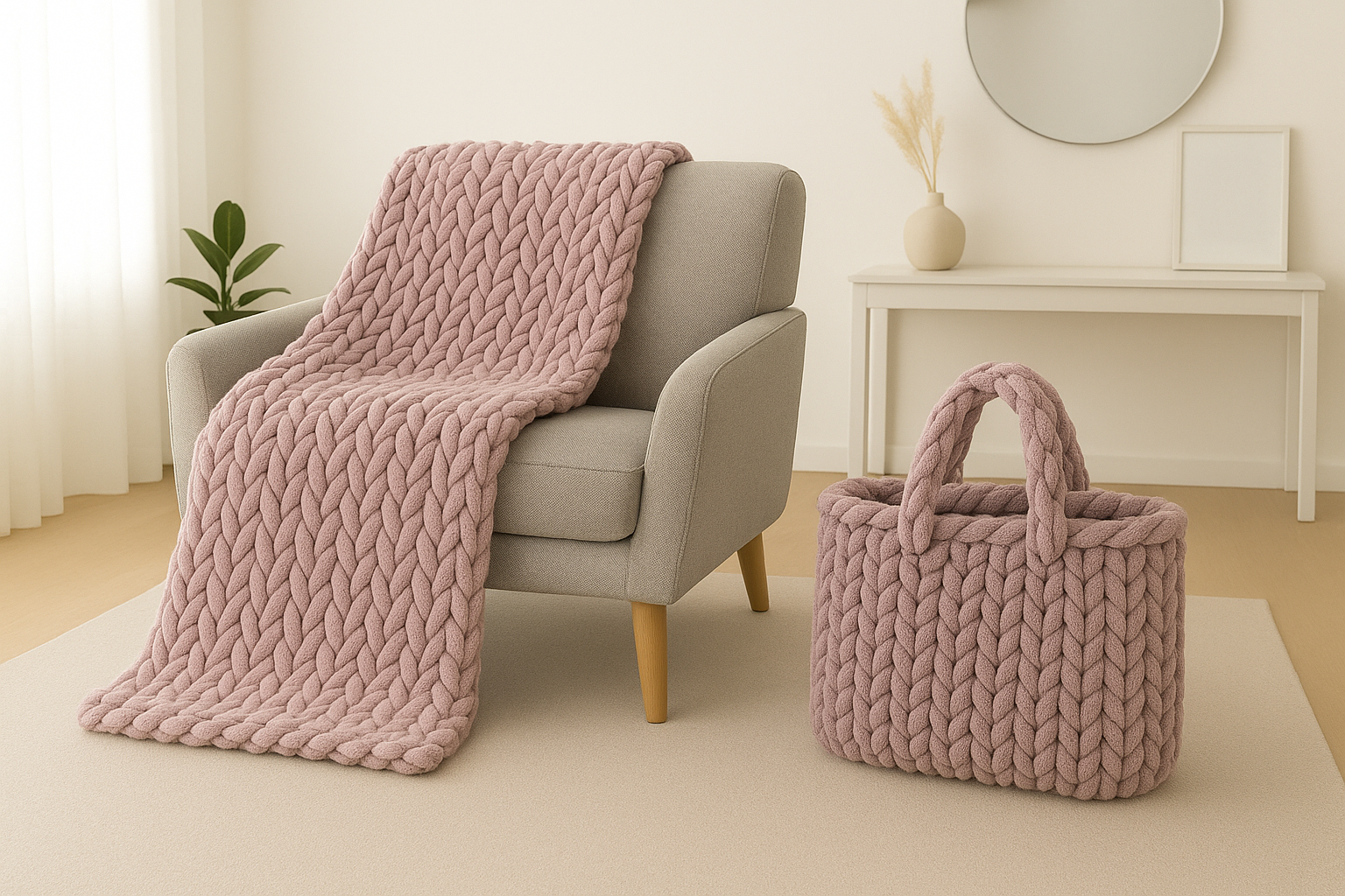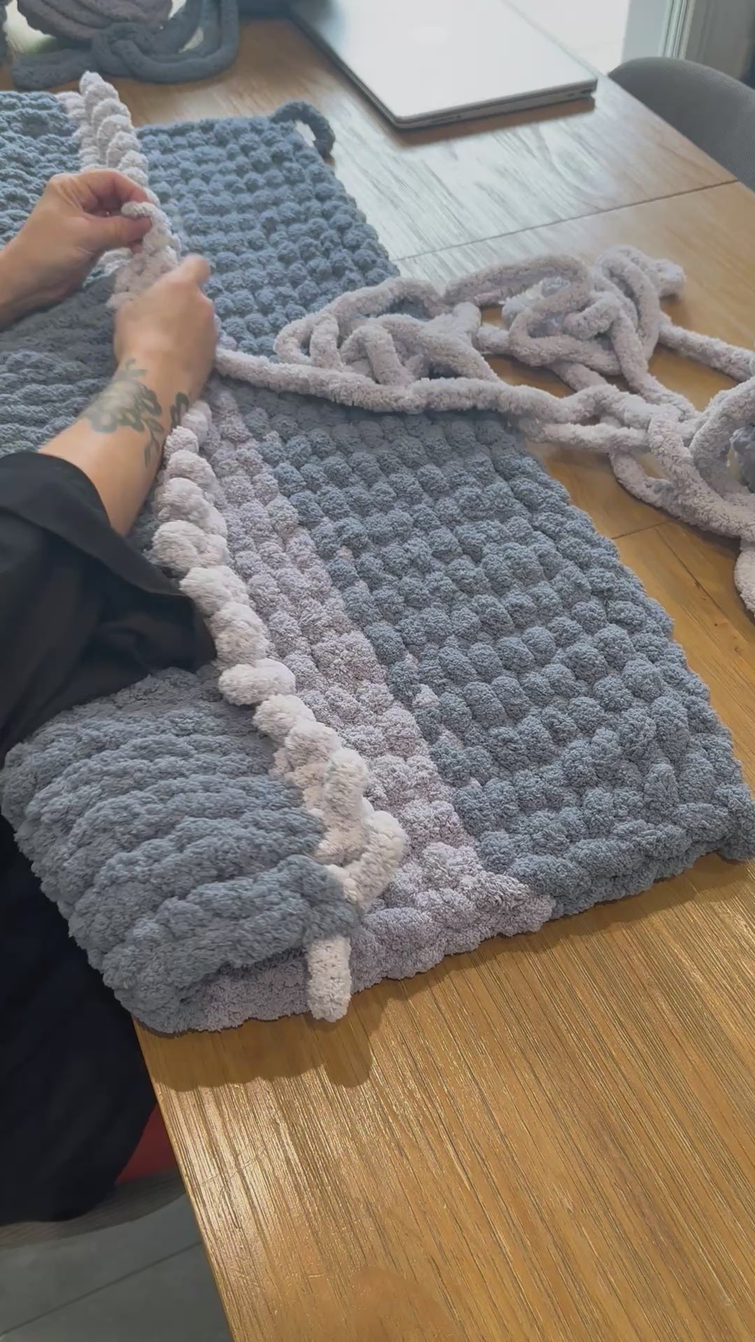 Chaque couverture est entièrement tricotée à la main, sans aiguille, avec du fil chenille épais et ultra-doux.